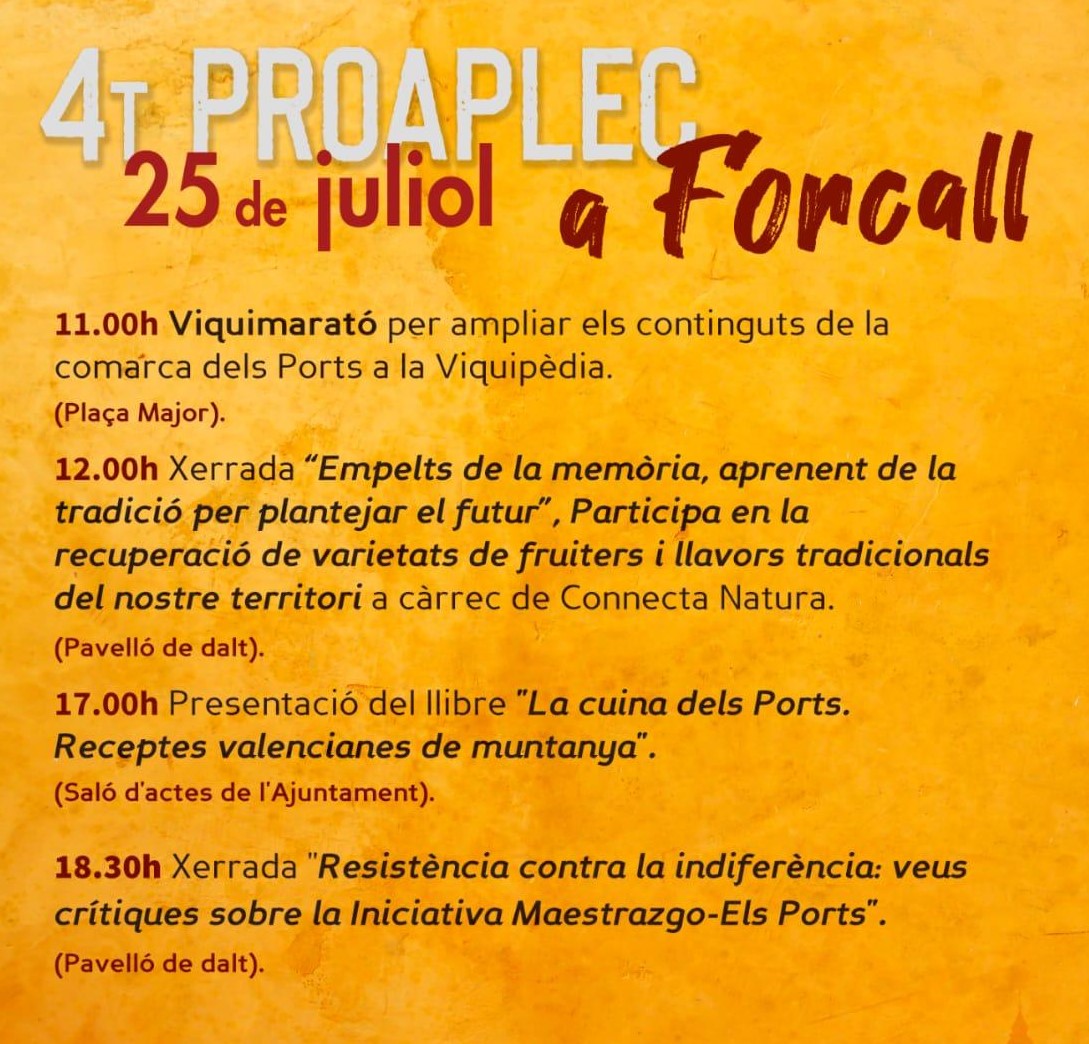 El cuarto Pro Aplec ha contado con diferentes charlas y presentaciones así como también con una Viquimarató para ampliar los contenidos de la Wikipedia alrededor de la comarca. Unas veinte personas han participado a la charla sobre recuperación de variedades de fruteros y semillas tradicionales del territorio y una treintena en la presentación del libro “La cuina dels Ports. Receptes valencianes de muntanya”. El acto central, la charla «Resistència contra la indiferència: veus crítiques sobre la iniciativa Maestrazgo – Els Ports», ha reunido más de un centenar de personas y han participado vecinos y vecinas de diferentes pueblos de la comarca de Els Ports provenientes de varios sectores económicos y grupos de edad.