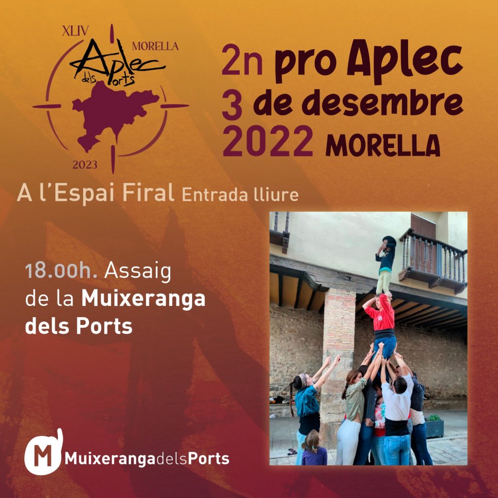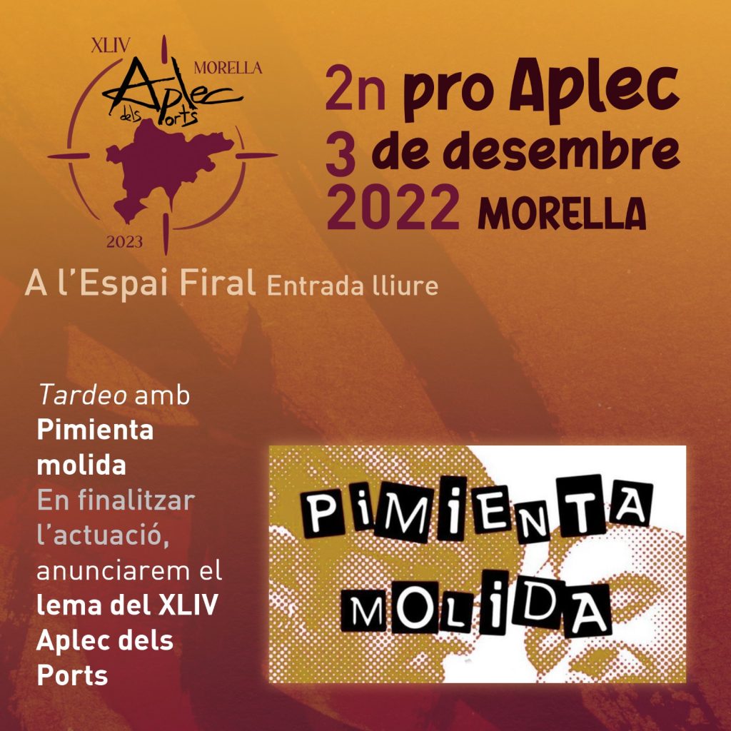 L’Aplec dels Ports continua el seu camí per a celebrar la 44a edició a Morella els dies 27, 28, 29 i 30 de juliol. Però abans de celebrar la gran festa comarcal, les festes proAplec omplin l’agenda de tot l’any d’activitats culturals i reivindicatives. Així, el dissabte 3 de desembre tindrà lloc la segona d’aquestes festes on es donarà a conéixer el lema del pròxim Aplec. L’acte de presentació serà al final d’una vesprada que comptarà amb les actuacions musicals de Trobadorets i Pimienta Molida a l’Espai Firal. A més, també estarà la Muixeranga dels Ports amb un assaig obert a totes i tots. Totes les activitats són gratuïtes.