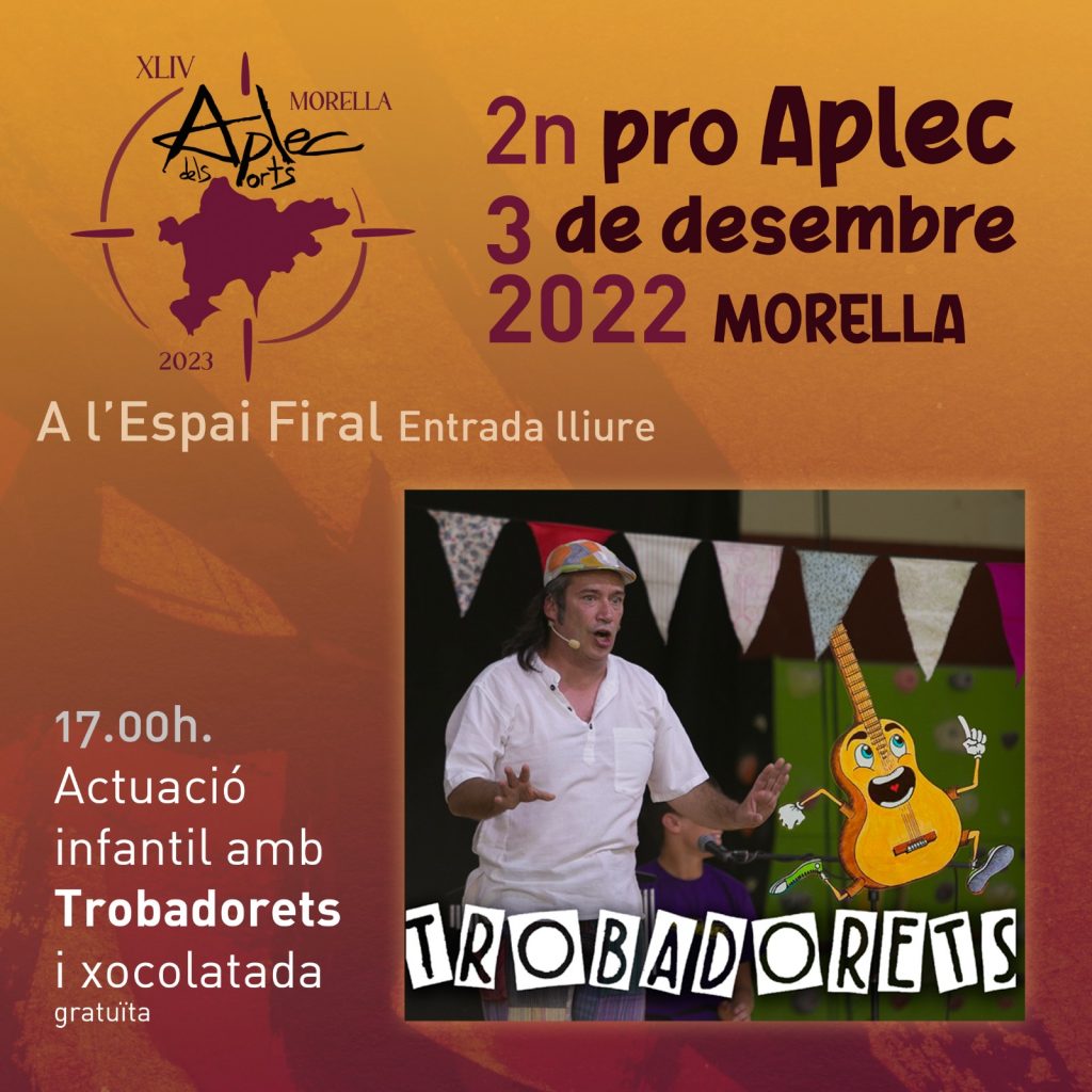 L’Aplec representa la unió de tota la comarca dels Ports. És per això que cal tindre en compte a les xiquetes i xiquets, així com la música que més els agrada. L’actuació de Trobadorets obrirà aquesta vesprada a les 17.00 hores A l’Espai Firal. També hi haurà xocolatada per a berenar.